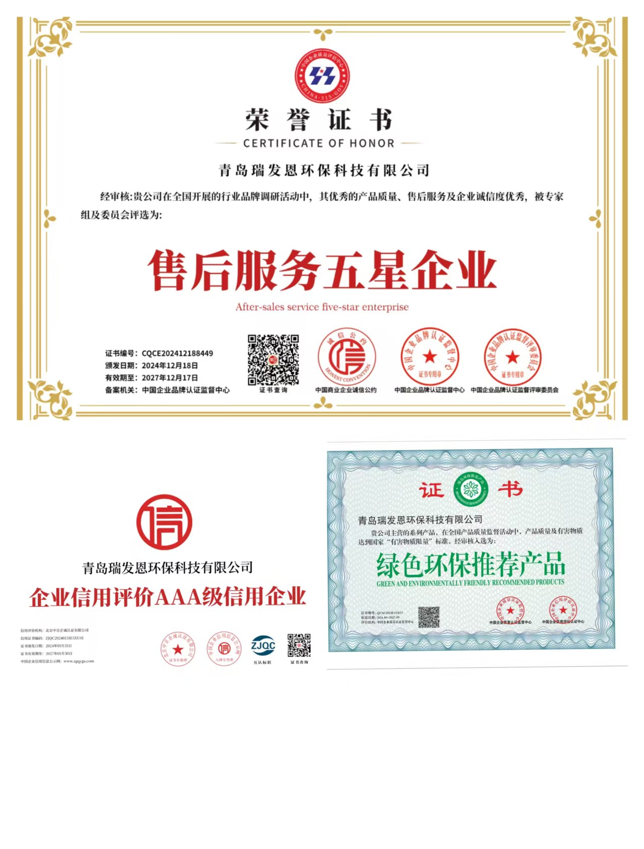 公司已經通過環保,質量,安全三項認證,并獲得AAA信用等級認可、綠色環保推薦產品、售后服務五星企業證書。